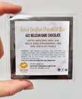 A decedent 60% Belgian dark chocolate bar topped with Freeze Dried Strawberries, Dried Mint Leaves and Mini Chocolate Pearls