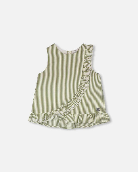 Deux Par Deux | Top Green & Off White Stripes With Embroidered Ruffle