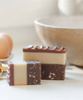 Every creation is made by hand, from hand stirring and blending, to pouring, cutting, trimming and packaging. Each batch takes approximately 3-4 hours from start to finish then “put to bed” for at least 24 hours. Each batch is hand cut and then cured for a minimum of 4 weeks to give you a hard, long-lasting, gentle bar.