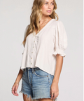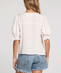 Crafted with a soft salt hued fabric, this top boasts a romantic v neckline and roomy gigot sleeves for a touch of old-fashioned charm.