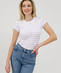 Our Ribbed Tee has a fitted body and hits just below your hips. She's made from a blend of cotton with a touch of spandex for that perfect amount of stretch. We recommend sticking true to size for this piece.