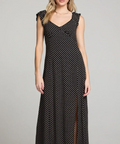 With sweet puffed sleeves and a fluttering skirt, Fiora is a classic polka dot midi. The cutout keyhole back and subtle slit lend flirtatious charm. The petite polka dot print goes with everything in your closet.