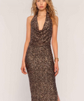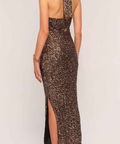 The Verda Dress is a classic silhouette made from an amazing, draped sequin. It features a slim fit, maxi-length skirt, and cowling neck. Be sure to shine at your next event in the Verda Dress.