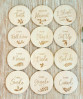 • Baby's Firsts set includes 11 wooden keepsake discs.