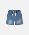 The French terry light blue denim shorts are a summer essential with a comfy twist. This pair features deep front slant pockets reinforced with topstitching, perfect for keeping treasures safely tucked in, along with an elastic waistband, drawstring, and belt loops for a secure fit. Made from soft stretch denim with a terry texture inside, it combines the look of jeans with the comfort of loungewear—perfect for boys and baby boys on the move.