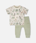 Deux Par Deux | Organic Cotton Jersey T-Shirt And Cotton Rib Pants Set Beige Zebra Print And Sage Green