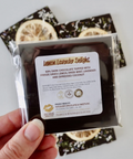 A decedent 64% Belgian dark chocolate bar topped with Freeze Dried Lemon slices, Dried Mint Leaves, Coconut and Lavender.