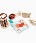 The ladybird rattle will emit a soft sound when shaken and the handle is easy for small hands to grip. The wooden bird teether is perfect for grasping and safe for chewing! The printed fabric square can be attached to a pram with a velcro tag and will make a crinkle sound when scrunched.