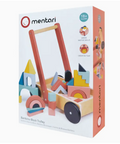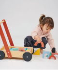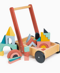 A wooden block tray on wheels which carries many colored blocks for building. The trolley can be pushed or pulled by the handle. All pieces are made from sustainable rubber wood and plywood, and finished in a non-toxic paint.