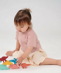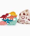 This wooden stacker set includes a Tyrannosaurus Rex, Triceratops, Stegosaurus, Brontosaurus, Iguanodon, Pterodactyl. All comes in a printed drawstring bag. All pieces are made from sustainable rubber wood. All Colored with a water-stain paint.