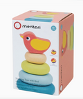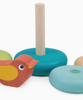 This wooden stacking toy comes with a base peg and 4 colored removable pieces. Decorated with a bird motif. All pieces are made from sustainable rubber wood. All colored with a water-stain paint.