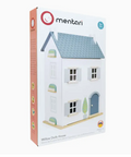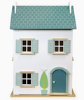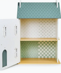 A two-story wooden doll's house with extra space in the attic that can be accessed through the removable roof. Opening windows and decorated shutters, illustrated inside walls. House is constructed using window boxes to secure. All pieces are made from sustainable rubber wood and plywood, and finished in a non-toxic paint.