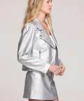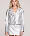 A shiny chrome take on the classic moto jacket look, Meritta is bold in the best way.