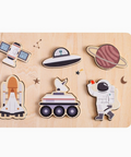 Get ready for an out-of-this-world adventure with this exciting space-themed wooden puzzle! Featuring six chunky pieces—an astronaut, space shuttle, satellite, Mars rover, planet, and even a UFO—this puzzle is perfect for little explorers eager to learn about the wonders of space.